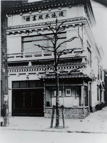 外国人に人気があった 木版画ですが、 どこで買ったかというと この渡邊版画店でした。 ジャパン・ツーリスト・ ビューローが出版した 『ビューロー読本』 (昭和6年)には、 新しい版画を求める客には、 銀座の渡邊版画店がよい という記載があります。 この写真は、 昭和14年の改築以降の 店舗です。