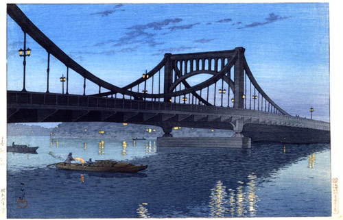 関東大震災後の復興事業で、 ドイツケルンの大吊橋を 模範として、昭和3年に 完成した橋です。 巴水はブルーを基調にして、 モダンな雰囲気を 表現しています。 しかし一方で、橋の下に、 火を焚いて働く 小舟を描くなど、 都市の新しさと 古さに注目しています。
