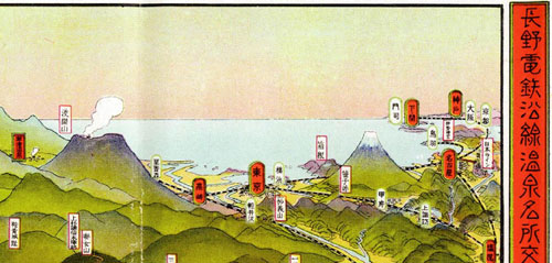 きょうは各地の鳥瞰図を たっぷりお見せしましょう。 まずは長野です。 ここにも富士山が 描かれていますね。 でも浅間山の すぐ裏側! さらに、当然のように 日本ラインも 登場しています。 そして‥‥