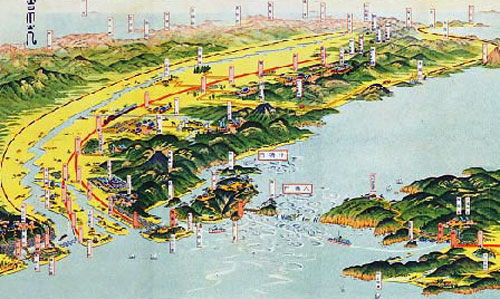 今日は、初三郎の弟子、 金子常光の鳥瞰図です。 彼は大正11年、 小山吉三と共に 「大正名所図絵社」から離れ、 小山が設立した 日本名所図絵社の 有力な画家として筆を振るい、 人気を得ていきました。