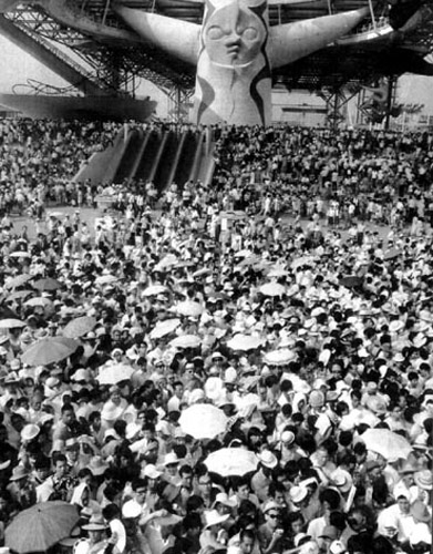 昭和45年(1970)の 大阪万国博覧会では 183日間の開催期間中、 全国各地から 6400万人もの 来場者を数えました。 「民族大移動」という 言葉が使われた この博覧会の 来場者たちは、 企業パビリオンで、 未来への時間旅行を 仮想体験し、 あるいは各国パビリオンで 未だ遠い外国への 観光旅行を想像しました。 それからさらに35年。 現在の日本人にとって、 行けない場所は 少なくなりましたね。
