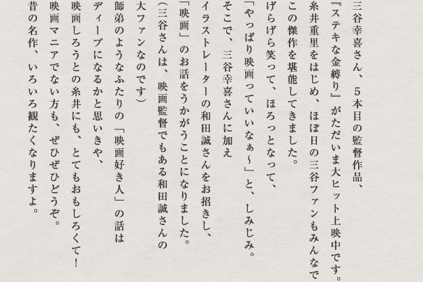 | うん。 でもぼくらは、ずっとそうじゃないんですよ。 つまり、異業種監督だから。 映画監督が終われば、日常に戻るわけです。 まぁ、三谷さんの場合は、 映画に近いことが日常ですけどね。 芝居のホン書いたり、テレビドラマ書いたり。 |