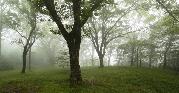▲梅雨から夏にかけて、富士山麓の森には、よく霧が出ます。