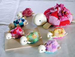 | くじ運が悪いというミーちゃんに大ラッキーが! 最後の最後に、すばらしいものが当たった事件だ。 それはそうと、 「今日,相馬さんから(パソコンの先生です) お手玉の亀の写真が届いたと思いますが、 先日「ミーちゃんの縁側」に、紀子の学生時代のお友達が 私に亀の様に長生きする様に 亀のお手玉を戴いたと書いたら メールで「亀のお手玉と言うのはどんなのか」と 聞いて来たので日記で説明を始めたが とてもうまく書けないので先生のデジカメで写していただき 直ぐ「送信」していただいたのです。 ということで、これが亀の写真です。 ___________________________ 2月11日(火)室温15℃ 湿度58%(あり) 今朝は暖かい。 つい、ちらっと温度計を見てしまったら16℃も有った。 着替えも簡単にさっさと出来た。 空は思った通り濃いグレーで まるでテントの中に入った様だ。 このところ朝、起きると肩が張っていて トックリのセーター等着ていると益々張ってくる。 紀子はパソコンのやり過ぎだと、脅かすが。 其れも有るかも知れない。うふふ。 でも、やりたいのだ。面白いものー。 昨日ちいちゃんから電話で明日の夜 近くの会場のコンサートに行かないかと誘われた。 出演者はあの懐かしい「水森亜土」さんで 「繪」の展示も有ると。 車で迎えに来てくれるとの事。 このところ「お遊び」が無いので 直ぐに、サンキュウとOKしてしまった。うふふ。 生活に変化が無かったので肩が張ったのかも知れない。と、 ミ-ちゃん流の「考え方」になる。うふ。 では、張り切ってGO−−−。 新聞取りに玄関を出たら道路等がしっとり濡れていて 小雨が降っていた。 ガラス越しには見えない様な雨だった。 初美さんのお友達が何人か来て 東京に住んでいる友達の指導で 午後と夜はトールペインティング教室が開かれる。 もう2階で始めている。楽しそうだ。 「ペン立て」に花を画く様だった。 夕方5時半にちいちゃんが迎えに来てくれるので 少し出かける準備をしましょう。 会場は隣町の「画廊」だった。 最初は「群馬テレビ」の収録か?アナウンサーが出ていて はじめたがその内、居なくなり 気軽にやり出した。 水森亜土さんは相変わらず可愛くて元気だった。 音楽に合わせて亜土さんが 黒板の様なところに貼ってある紙に「繪」を両手で描いては 一枚毎に亜土さんが籤を引き番号が出ると読み上げる。 その「入場券」の半券を持っていた人が 出ている繪の当選者になるので 会場は燃える様な観客の興奮となった。 私は「くじ運」はとても悪いので諦めながらも、 しっかりと入場券を握り番号読みを待っていた。 黒板の「繪」が全部終わると係りの人が 「はい、これから最後に一番良い物の籤引きです」 と言って亜土さんが引いた。 亜土さんが大きな声で「17番です」!!!。 思わず私は掛けていた椅子から跳び上がった。 夢にも思わない当選で。・・・・・。 椅子は12列程で私は前から3列目だったので、 簡単に出て行って、其の「繪」を受け取って来た。 狭い会場はうわーと言う声で沸いた。 こんな事、初めてだったので恥ずかしくて、 ちいちゃんに「一番良いのがあたって良かったわねー」と 喜んでもらって初めて当ったんだと感じた。 徐々に解散した。 会場の隣のレストランでチョッピリ興奮をやわらげて、 帰りに岡部家へよってお礼やら 「繪」の「見せびらかし」をして来た。 2階の教室には未だ何人か居るらしい。 2月12日(水)室温・湿度(見なかった) 今朝は目覚めが遅かった。 久し振りでいろいろ有ったので疲れたのかな? メールだけは開いてみて無い事が解ったので 大至急お掃除してあまり良いお天気なので 洗濯機も動かしておき、 昨夜初美さんのお友達が泊まったらしいので 皆で朝は食事を一緒にするかな?と、考えていたが 私は先にすませた。 今日は先生の来てくれる日なので 「お絵書き」ももう少ししておきたいしと気がせいていた。 手順が悪くてお花の活け替え等にも時間がかかり、 ほっとしたら未だ洗濯物が干して無かった。 お日様も出ていて良いお天気だが慌てて外に干して、 やれやれと戻りながら 花の様子を見たら福寿草がパッチリと咲いていた。 鉢の中の土が少なくて 寒いかと思って腐葉土を入れてやった。 其の後はマックちゃんと「お絵書き」を少ししていたら 初美さんが「御飯ですよー」と呼びに来た。 午後は、部屋に居ると解らないが風が有るらしい。 先生は3時10分前に見えた。 私が描いておいた(未だ少しだけ)「繪」の続きを 横から見ていてあれこれ言ってくれるのだが 私もはがゆいが先生はどんなに「はがゆいか」と 気の毒になった。うふふ。笑い事ではありませんよ。 まだ、まだ私は気に入らないが 他の事も聞きたいので止めてもらった。 解らない事ばかりだが、やるきゃない。 ミーちゃん頑張れ!!! 2月13日(木)室温16℃ 湿度52%(午前あり) 目が醒めて暫くじっと我慢していたが 其の内起きだして昨日の日記を書いた。 空には何も見え無かったが晴れそうな気がした。 6