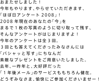 ほぼ日刊イトイ新聞のアンケート企画、 「ほぼ日アンケート2008」に ご参加いただき、ありがとうございます! まず、最初に、今年のアンケートについて、 知っておいてほしいことをお知らせいたしますね。 答える前に、ちょっと目を通してください。 今年もどうぞ、よろしくお願いしますー。 ![]() 「ほぼ日アンケート2008」は、