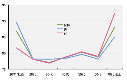 30代までは男性の方が「長く生きるつもり」で、 40代からは逆転して女性の方が 「長く生きるつもり」ですね。 年代では、30代が最も短く、 「77歳くらい」という回答でした。