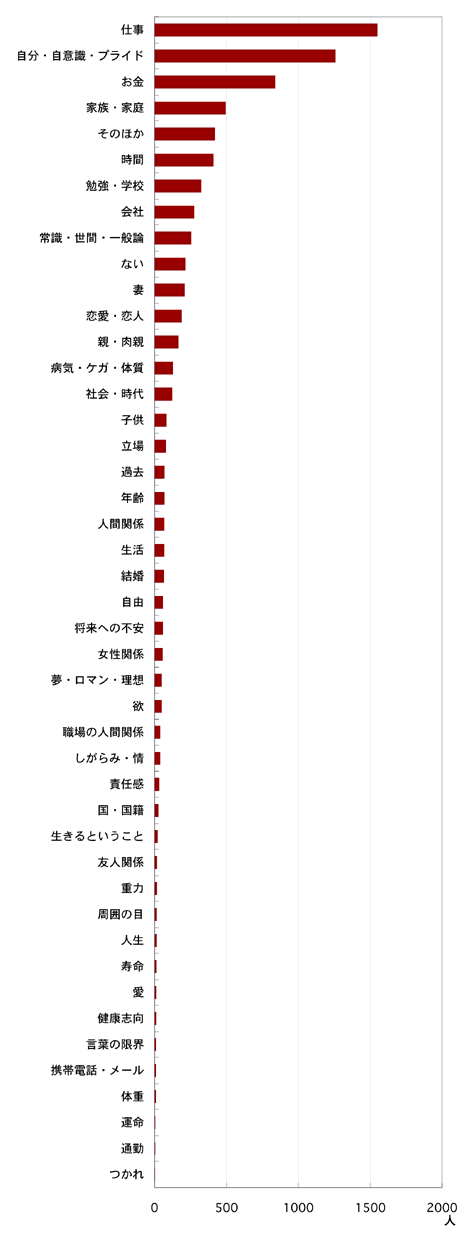 【男たちの回答】 ・人見知りで面倒くさがりな自分の性格。 ・生後一ヶ月の子供。喜んで束縛されていますよ。 ・私生活でも人目を気にしなければならない自分の職業(教育公務員です)。 ・人並みの人生を送りたいという、ちゃちな願望。 それさえ捨て去れば、波乱万丈の人生を送れるはずなのだ! ・世間一般のおばちゃん。あれは、地球外から送り込まれたに決まっている。 扱い方がわからない。部下に持つと非常に、困る。 ・社内政治。 ・心配性な恋人。 ・束縛‥‥束縛されてない、ですね、されていません。 ちょっと発想が「残りの人生短いしなあ‥‥」という考え方を 前提とするようになったことくらいですかね。 ・慰謝料。 ・自由という名の不自由。 ・受験勉強。(あぁッ!こんなアンケート答えてる場合じゃない!) ・“全部ほどほど”症。 ・姉がパソコンを占領します。 ・言葉の壁。マルチリンガルになりたい。 ・勇気が足りなくて、あらゆる状況が行き詰っている。 ・奥さん、家内、妻、嫁、あの人がいる限り自由になれない! ・16歳の時に心に誓った、「正しい道を選べ」という言葉 ・運動しなきゃいけないという観念。 ・娘(の塾通いの送り迎え)⇒車乗るから晩酌出来ないんだよね。 ・無駄な高学歴。 ・食わず嫌いの多い自分をわかっていながら その状況を打破しようとしない自分。 ・小遣いが少ない。 ・現状に割と満足してる自分自身。 ・肩書きですかね。 ・社長からの期待。重圧すぎて、もがいてしまう‥‥。 ・人見知りで面倒くさがりな自分の性格。 ・決断しないこと。 ・介護。 ・以前「心筋梗塞」にかかったから、 無理できないというのが一番の束縛ですね。 ・音楽かなぁ‥‥。自分を束縛するほど好きなんだろうな。 ・過ぎるのを待つしかない時間。 早く大学生なんて終わらせて、社会で勝負したい。 ・夢に向かっていく時に伴う「不安」、 女に告白してフラレるかもという「不安」。 ・携帯電話。 ・安定志向という自分の中に存在する保身的な考え。 ・恐怖心。新しいこと、自分らしいことを始めることへの恐怖心。 ・相手の出方。「空気を読むこと」とも云える。 ・栄養補給&健康志向。 ・息子をお風呂にいれるため、夜7時から8時までは自由がない。 ・当然そうあるべきだ! という風な周囲からの期待。 ・家内の、日々小生に対する注意(度が過ぎる)。 ・毎日でも会いたい、と言う彼女。 ・変化を求めない気持ち。 ・没頭する趣味が無いこと。 ・本家の長男という立場。 ・忘年会の幹事。 ・漫画家という夢。 ・年齢相応な行動を求められること。 ・束縛? そんな言葉は俺には関係ねぇな。 強いて言うならこの世の義理人情って奴か‥‥。 ・犬だな、犬の散歩だな、ジャックは大変なんだぜ。 ・養子になるコトへのプレッシャー。 ・なんとなく、バイセクシャルだと生き辛いときがあるな、たまにだけどよ! ・メタボ対策のため、ラーメンを食べられる日が1週間に1回。 ・地球の重力。 ・冬の寒さ。かなり行動が制限されている。 ・男だからこうしなきゃ、こうしちゃ駄目みたいな無駄な意地 ・大量消費しなければいけない、 結婚しなければいけないような空気がある社会。 ・バカ官僚ーーーーーーーーーーーーーー!!!!!!! ・まわりが自分に求めているだろうと思う自分像を自分が演じていること。 ・中途半端な責任感。 ・中途半端な才能 ・中途半端なプライド。 ・中途半端な自由。 ・マンションを買ってしまい、他の土地へ移れないこと。 ・システム!(コンピューターという意味ではない。) ・健康で長生きしてくれ、という妻の思い。 ・今よりも良くならなくては、成長しなくてはと思っている自分自身。 |