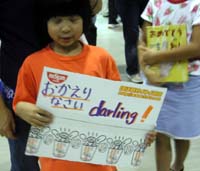 スタッフの皆様 お出迎えの皆様 そして誰よりdarling 長旅お疲れ様でした。 べっかむ3に声をかけて頂いたWILDパーMです。(笑) 私の住んでいる鹿嶋地区では 全く育Tを見かけることがなくて 淋しい思いをしていたので あんなに大勢の育Tイストをまじかに見られて幸せでした。 darlingにお会いした事も忘 れられないきっと思い出になります。 あっという間の一時だったけどとても楽しめました。 久しぶりに鹿嶋に住んでいて良かったと思いました。 (いい所ですけどね) 成田が近くて。 また お出迎えでも お見送りでも行きますよっ!! 育T・・・ 気合を入れて20年(いや・・・もっと) 育てていきます! darling 我が家にいた「さると」 味わってくださいね。 スタッフの皆様 お世話になりました。 お出迎えの育Tイストの皆様 お目にかかれて幸せです! ・・・また どこかでねっ!・・・ (りか) ただいま、成田より戻りました。 ONLYパーにジーパン、小柄で黒髪、 15:05くらいに到着のわたしでした。 はじめて、自分以外の人たちが 育Tを着ているのを見ました。 なんだか嬉しいものですね! 諸事情あり、昼飯たべずに列車に飛び乗り、 ぎりぎりセーフでdarlingをお迎えできて、 そりゃもう、嬉しかったです! なんか緊張して無口なわたしでした。 darlingさまが「恐縮です!」といいながら みんなにくれたグミが、すきっぱらにしみました。 スタッフの皆様とお会いできて、うれしかったー! darlingさまも、お元気そうで! 黙ってぼーっと立っていたけど、 実はどきどきもじもじのヨワヨワでした。 でも、ああ、うれしい午後でした。 みなさまこれから打ち上げでしょうか? その後はどうぞ、ゆっくりお休みくださいね。 私はこれから、今日の午後やる予定だったお仕事を じゃんじゃんばりばりとやりますっ。 それではまた! (のばら) お出迎えイベントに参加したポンチョです。 子供が待ちくたびれてしまった感もありましたが、 クマのグミやら、キャンディやらdarlingにいただいて ありがとうございました。 長旅の疲れもそれほど見えずお元気そうで何よりでした。 最後の最後に違う方向に帰りそうになったdarlingに スタッフの方が 「糸井さんこっちです!」と叫んでいたのが笑えました。 ほぼ日乗組員の方々も いつもほぼ日で見ているので 初めてお会いする気がしなくて 不思議な感じでした。 ほぼ日乗組員の方々の、 盛大なプラカードには負けてしまいましたが 急ごしらえの手書きのボードを作った甲斐がありました。 小1の娘は疲れたようで、 今、爆睡モードに入ってしまいました。 ここで、行かれなかった中1の長女が 一言自分でメールを打ちたいと言うのでかわります。 ほぼにちわ。 今日はお出迎えに行くか、部活に行くかかなり迷いました。 しかし、試合が近いので・・・。 (ちなみに卓球部です)残念でした。 darlingがサインしてくれた、 『おめでとうのいちねんせい』という本は、私が小学 1年生のとき買ったものです。 妹たちがほぼ日に載ったと聞いて、 急いでほぼ日を見ました。 これからも、ほぼ日楽しく見たいです! (ポンチョ)