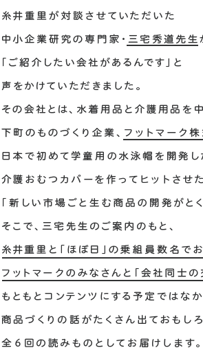 | そこで思いだしたのが、最近フットマークさんでは、 「中学生たちと商品開発を進めている」そうなんです。 今日のお話の足がかりとしまして、 まずはそちらのプロジェクトについて 三瓶社長からお話しいただくのはいかがでしょうか。 |