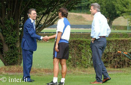 会長の座こそ退きましたが インテルのオーナーであり続ける マッシモ・モラッティは、 インテルを買った時から、 彼らが日本でプレイするのを見たいものだと、 願いつづけてきました。 理由はふたつ。 ひとつは彼が「日出づる処の国」日本の 大ファンであるから。 ふたつめは、 そこでは世界一のクラブ・チームを決める トヨタ・カップが開かれるからです。 インテルは欧州選手権 (UEFAチャンピオンズ・リーグ)に 勝てなかったので、 南アメリカのチャンピオン・チームと 日本で対戦する夢は叶いませんでした。 でも、来る7月27日に、 インテルのオーナーであるマッシモ・モラッティと ジアチント・ファケッティ会長の、 燦然と輝くこの夢の「半分」が 叶おうとしています。 そう、「半分」がね。 インテルが日本でプレイするのは、 もうみなさんご存知のことですよね。 埼玉カップの豪華な親善試合を 浦和レッズとプレイするのです。 話がこれで終れば 珍事でもなんでもなかったのですが、 日本へ行くということが インテルに苦しい選択を迫っていたのです。 ファケッティ会長とマンチーニ新監督は、 インテルがUEFAチャンピオンズ・リーグを よもや予選から闘うはめにおちいるとは 誰も考えていなかった、 今から数カ月前に下されていた、 ある決定がもたらした問題を前に困惑しました。 ![]() モラッティ、マンチーニ、ファケッティ 二重契約が判明したから、なのです。 浦和レッズとの親善試合の契約をした責任者は、 すでに、インテルを辞職させられています。 そして新しい経営陣たちの頭の中では、 この浦和レッズとの試合の契約が、 なんと、すっぽ抜けていたのです。 その一方で、 新しい経営陣は新しい別の契約を ちゃくちゃくと進めました。 トロフェオ(トロフィー)TIMという名前で、 イタリアの3大宿敵の三角形、つまり ACミランとユベントスとインテルが サン・シーロ競技場で闘う契約です。 問題は、その試合がいつか、ということです。 もう、おわかりでしょう? そう、7月27日の夜。 インテルが埼玉でプレイしているはずの日です。