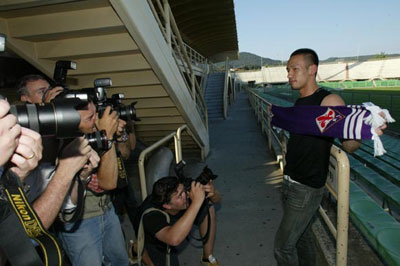 写真のフラッシュのきらめきと、 テレビカメラがたてる虫の羽音のような 静かなうなりに囲まれるようにして、 エミリアーノ・モンドニコ監督は現れました。 50人ほどの記者が彼を待ち受けていましたが、 その中には12人ほどの日本人記者もいました。 フィオレンティーナの エミリアーノ・モンドニコ監督にとって、 中田から最初に受けた印象は、 嬉しい驚きだったようです。 モンドニコは、中田英寿の最初の衝撃を、 こんなふうに説明してくれました。 「彼は偉大な人格者ですね。 とくに、彼が礼儀正しく紳士的であることは、 私にはすぐわかりました。 彼について私に伝えられていた印象とは、 まるっきり別のものでした」 中田は、フィオレンティーナの紫色のシャツを着る 最初の日本人です。 フィオレンティーナは歴史のあるチームですが、 2002年の組織の破産によって降格し、 この2年間というものセリエCとセリエBで プレイせざるを得ませんでした。 ようやくセリエAに戻れることが 決まったばかりです。 そんなわけで、 新生フィオレンティーナの再建に向けて、 中田はその礎石ともいうべき存在です。 彼を強力に望んだのは、モンドニコ監督本人と、 東京に大きな靴店を開こうとしている デッラ・ヴァッレ会長でした。 モンドニコは続けます。 「中田は、私の監督としての長い長いキャリアの中で 持った様々な選手たちの中でも、 まちがいなく最重要な選手です。 私はヴィエリなどの 偉大なチャンピオンたちも持ちましたが、 この日本人がその開放的な微笑みと、 私を戸惑わせるほどに紳士的な態度で私に与えた印象は、 他の誰からも受けたことのないものでした」 ![]()