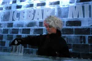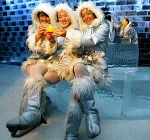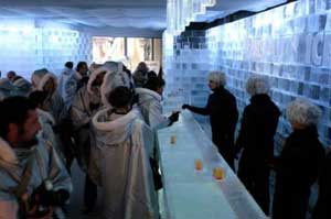 まず内装は氷。‥‥氷だけ! そう、氷でつくられた店なんです。 このとんでもないレストラン・バーの オープニング・パーティーには VIPたちがこぞって現れました。 自分を見せるびらかすチャンスには、 絶対に姿をあらわすような人びと、 そう、俳優、モデル、有名なジャーナリスト、 そしてサッカー選手たちが。 真っ先に来たのはココとヴィエリでしたよ。 (ううむ、やっぱり。) ここは壁も床も、 テーブルからカウンターから椅子までも、 すべてが氷でできたレストランです。 バールのコーナーもあります。 オープンしたのは先週で、 場所はミラノのジェルザレンメ広場。 イタリア国営放送局のRAIをはじめ、 大手のテレビ局がこのことを話題にしました。 ![]() ここのバーテンダーや店員たちの服装は、 コザック帽と毛皮、そして厚ぼったいセーターです。 彼らはたった一度しか使わないグラスで、 飲み物を運んできます。 そうです、グラスも透き通った氷でできているので 洗ってまた使うわけにはいきません。 天井からは鍾乳石の形のランプが下がり、 これはもちろん氷じゃなくてプラスチック製なのですが、 すぐに流行になって誰かがマネできたのは、 この店の中ではこのランプだけでしょう。 ランプはなぜ氷じゃないか? 氷がとけたら、すぐにショートしてしまいますからね。 ここはミラノ、北極ではありませんが、 中はおそろしく寒いです。 室温をきっちりマイナス5度に設定してあるのです。