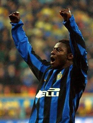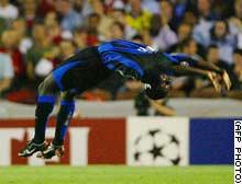 そんなマルティンスのゴールのお陰で、 2月23日のUEFAチャンピオンズ・リーグの対ポルト戦を、 インテルは1対1の引き分けに持ち込みました。 ポルトは昨年のヨーロッパ・チャンピオンであり、 最後のトヨタ・カップの優勝チームですね。 インテルにはアドリアーノやヴィエリなど、 彼よりも強いとされるアタッカーがいますが、 彼の素早さとゴール能力はとんでもないものです。 平均すると71分に1ゴールの割合です。 インテルのオーナーであるマッシモ・モラッティは、 マルティンスがゴールするたびに1万ユーロを 彼にプレゼントするのですが、 それは彼には渡されるのではなくて、 彼の母親と6人の兄弟のマルティンス一家の暮らす ラゴスの地へ、直接送られます。 マルティンスがインテルのティフォーゾばかりでなく イタリアのサッカーファンの誰からも愛されているのは、 自分が楽しむだけではなく、 いつも観衆を楽しませようとする 彼の気持ちの表しかたがあるからです。 ゴールの度に彼は喜びをトリプル宙返りで表します。 これはもう彼のトレードマークになりましたね。 ほんとうに喜びに満ちていて好感がもてます。 ![]() ![]() ![]() ところで、オバフェミという名前は イタリアの観衆たちには長くて発音しにくいので、 彼は「オバオバ」というニックネームで呼ばれます。 リオ・デ・ジャネイロの有名なサンバのバンドと同じで、 でもマルティンスはナイジェリア人なんですが、 ま、固いことは言わない言わない。 もっか彼はミラノで一人暮らしです。 彼を孤独との闘いからすくってくれるのは、 よく食事に招待してくれるモラッティやヴィエリの 家族ぐるみの友情です。 ヴィエリに至っては、 ことオバオバに関する限り、 まるで「親代わり」の気分のようです。 批判から彼をまもり、ミラノの寒い夜には彼を誘ったり、 時には彼をディスコに連れて行くこともあるとのことです。 ディスコの帝王ヴィエリといえども、 あまり夜がふける前にオバオバを家に連れて帰れるように、 ちゃんと気を付けているみたいですよ。 インテルはポルトとの引き分けで 新記録を打ち立てました。 カンピオナート、コッパ・イタリア、 UEFAチャンピオンズ・リーグを通して38試合、 負け無しという記録です。 これはインテルが誇れる快挙です。 幸運なことに、まだサッカーを 純粋な楽しみとして表現している 20才の若いオバオバも、 この記録を誇りにして良いでしょう。 ![]()