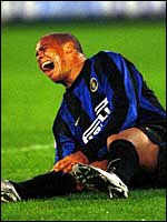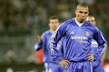さて2005年3月9日水曜日、 舞台はふたたびUEFAチャンピオンズ・リーグです。 彼は雪辱をはたせるかに見えました。 レアルはユベントスとの1回戦を勝っており、 トリノでの2回戦も引き分けにできそうな感じでした。 ところがユーべのトレセゲがゴールを入れて、 試合の様子は一気に変わります。 ロナウドが本当の意味でレアル側の唯一の 危険人物だったのですが、 タッキナルディに対するリアクションでファールを犯し、 審判が出したのはレッド・カードでした。 ロナウド、タッキナルディ、ともに退場です。 この対戦は合計点でレアルをおさえたユーベが勝ち、 同時にレアルは UEFAチャンピオンズ・リーグから敗退しました。 ロナウドは、ふたたびトリノの競技場から、 負けて、うちひしがれて、怒りにみちて退場です。 彼は試合のあとで、またもや、 ユーべは審判たちから特別に守られているチームだと 言い張りました。 「イタリアでユーべを負かすのはほとんど不可能だ、 ユーべはひいきされ続けている」と。 そして唐突にも、彼はこう言い足しました。 「レアル・マドリードは ぼくにとって居心地がいいけれど、 もし移るとしたらインテルにもどりたいな」 ![]()