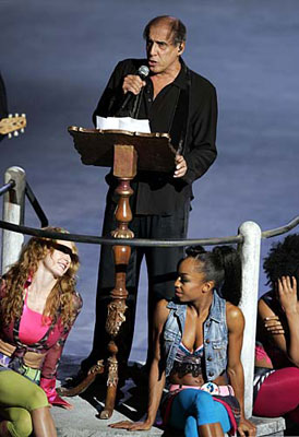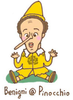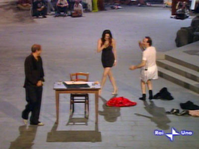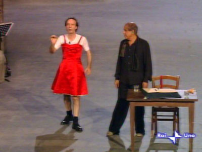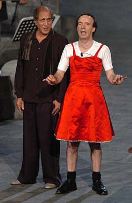 そして繰り広げられたベルルスコーニに対する 風刺の数々‥‥! これが政治家たちの気に入るはずがありません。 中には次回を廃止するように要求した政治家さえいました。 でも、そのショーの楽しかったこと!! 女装したベニーニはチェレンターノと共に踊り、 とても有名な60年代の歌のひとつ 「Siamo la coppia piu` bella del mondo」 (私たちは世界一すてきなカップル)を歌ったかと思うと、 次には真顔になってイタリア古典文学の代表作 ダンテの『神曲』から数節を語り、 それから全てのイタリア人たちに ソクラテスを読むように薦めました。 そうすれば現在彼らが生きている政治的な瞬間が もっと良く分かるというのです。 ![]()