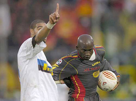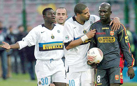 侮辱されたゾロがボールを地面から手にとり、 両腕でしっかりとかかえて 更衣室に続くゲートへ向かった時、 彼のチーム、メッシーナは 2対0で負けそうな状態でした。 ゾロは審判の方を向いて言いました。 「ぼくは、もうプレイしません。 ぼくは人間ですが、 まるで動物のように扱われています」と。 審判が驚いたまま立ちつくしていると、 対戦相手であるインテルの選手がふたり、 ゾロに近寄ってきました。 ピッチに残って試合を続けるように、 ゾロを説得したかったのです。 ![]() インテルの選手、アドリアーノとマルティンスは、 ゾロを抱きかかえるようにして、 自分たちのティフォーゾがゾロに対して しでかした事を、あやまりました。 ![]() アドリアーノの肌はカフェラッテ色、 つまりゾロのより少し明るい色で、 アフリカのナイジェリア出身のマルティンスは、 ゾロとまったく同じように漆黒の肌色です。 「ぼくらも、試合のある日曜日ごとに侮辱されているよ。 でも、だからこそ、ぼくらを猿のように扱う連中に 負けるわけにはいかない。 お願いだからゲームを続けてくれ、 そうすれば、この文化の闘争を一緒に戦えるんだよ」 かれらはゾロを、こう言って説得したそうです。 そしてゾロは、この説得に応じ、 10分後には試合が再開されたのですが、試合後に、 だれもインテルの勝利については話さず、 このアフリカ人選手が目的をもって起こした 態度のことばかりが語られました。 全員が口をひらいて、なんだかのコメントをしました。 翌日には、ヨーロッパ最優秀選手に贈られる バロン・ドーロ賞を、パリで受賞していた ロナウディーニョまでが、 連帯感のこもった言葉を口にしました。 イタリアサッカーの条例は、 重大な人種差別が示された場合に審判が試合を中断し、 その行動が有罪とみなされたティフォーゾを持つチームは 「負け」とされることを、想定しています。 今回インテルは、罰則としての「負け」の判定は 受けませんでした。 しかし、インテルのティフォーゾたちは今後、 もっと礼儀正しく、たしなみのある態度をとるべきです。 そうでないと、この次には、たいへんに重大な罰則が 課せられる可能性もあります。 インテルは、 昨年度のUEFAチャンピオンズ・リーグ試合中に、 ティフォーゾが発煙筒をACミランのゴール・キーパーの ディーダに、命中させる事件を起こしました。 そのことに対するペナルティーで、 同選手権の今年度最初の4試合は 無観客で行いました。 その発煙筒騒ぎにたいするの罰の後で、 さらに重大な罰則をうける悪夢が、 いまやインテルを待ち受けています。