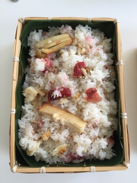 梅干しの炊き込みご飯は、籠のお弁当箱に笹を敷いて詰めました。