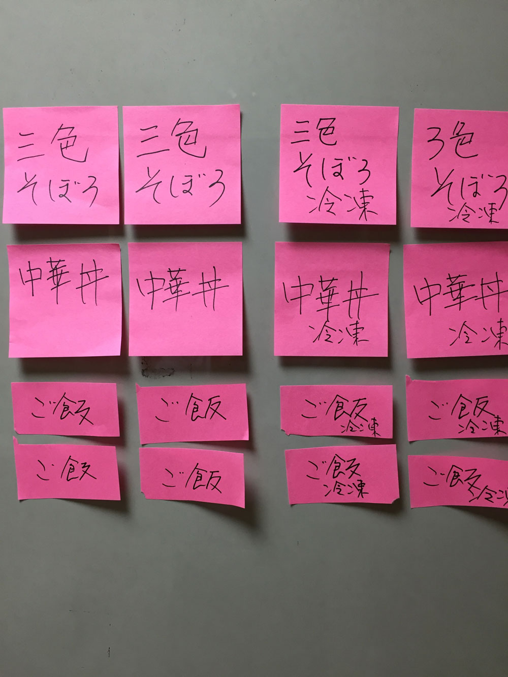 1回分ずつ付箋にかき分け、冷蔵庫の正面扉に貼って、
