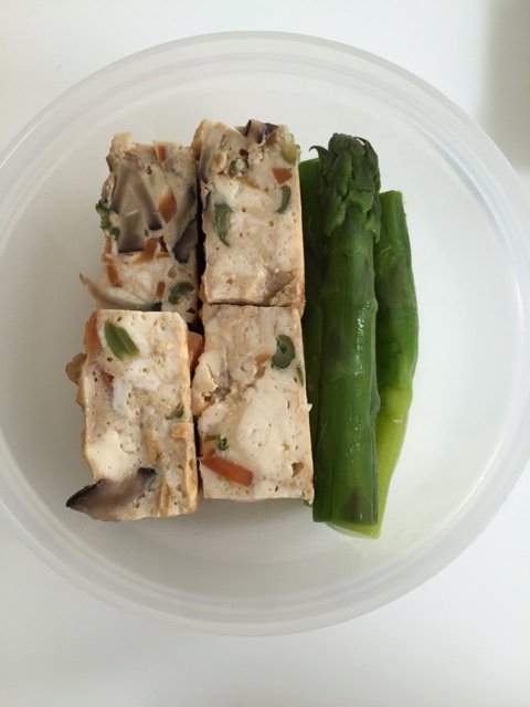 豆腐入り卵焼き、グリーンアスパラ昆布漬け。