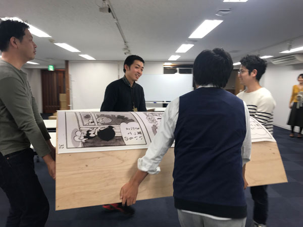 社内の大型プリンターの出力容量とベニヤ板の大きさに合わせて、本のサイズが決まりました。それをどう立体的に見せたらいいか。本になだらかな湾曲をつけたところがチャーム・ポイントです。手塚さんのマンガのキャラクターたちが、ほのぼのとお腹をあたためてくれるイメージです。