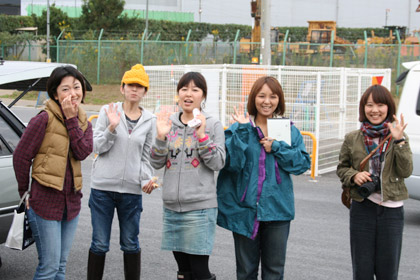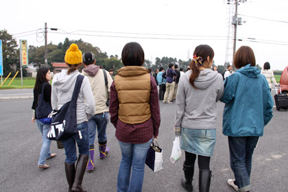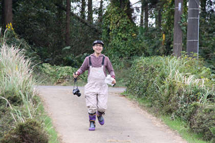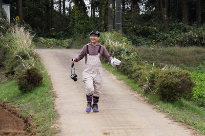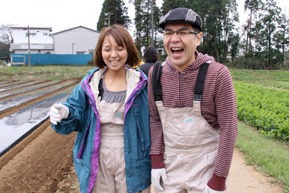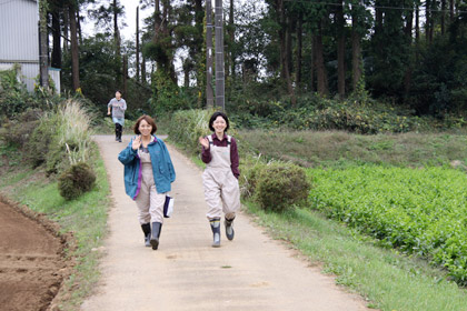 現場では、つなぎも貸してくれたんです。 着替えたい人はそれに着替えて、 畑に向かいました。 |