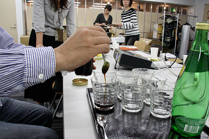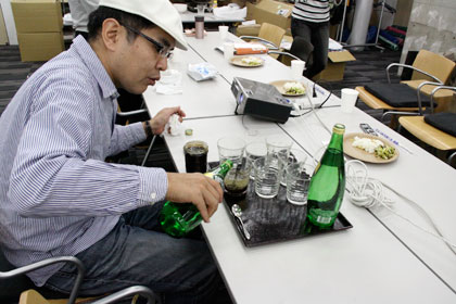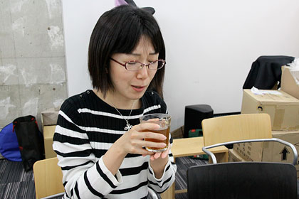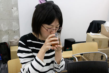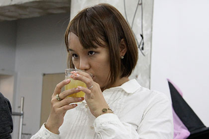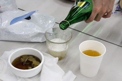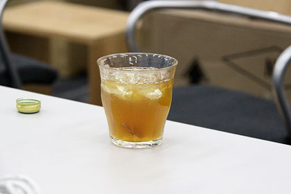 いや、これ、混ざらない。 濃すぎて冷たい炭酸水に、 なかなか混ざらないんですよ。 ‥‥ちょっと待ってくださいね。 よーく混ぜれば‥‥よし、混ざった。 どうでしょう? |