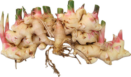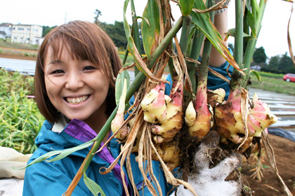 | すごい迫力ですよねー。 「親しょうが」から分かれた新しい地下茎を、 「新しょうが」と呼ぶのだそうです。 「ひねしょうが」と比べると、 やわらかくて辛みがすくないのが特徴です。 |