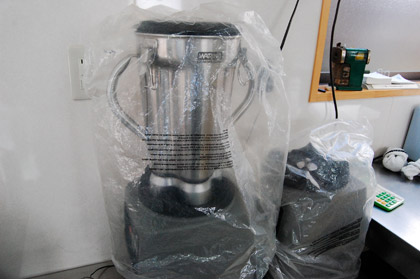 どろどろになったしょうがを、 さらしに巻いて、汁をしぼります。 それでもすべてはしぼりきれないので、 さらに遠心分離器で、 徹底的にしぼりだします。 |