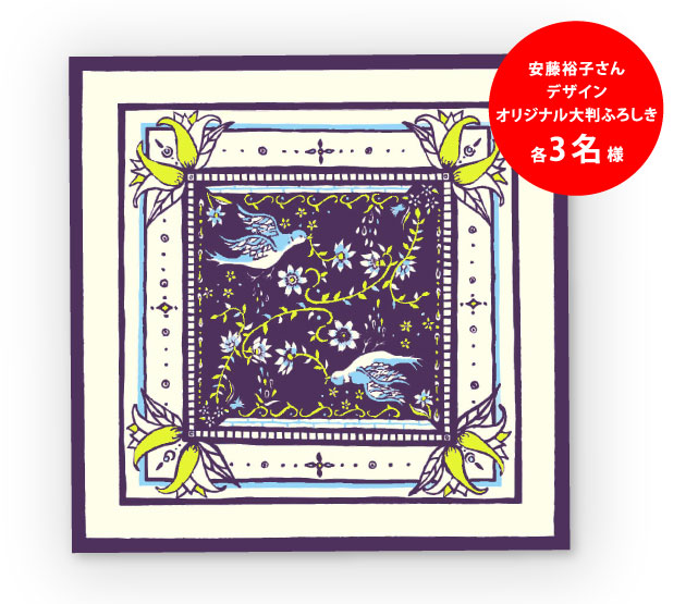 今回みなさまには、 過去に限定発売していました、 安藤裕子デザインのオリジナル大判ふろしきを 特別にご用意いたしました。 一枚一枚、京都伝統の技によって 職人さんが染め上げた、こだわりの一品です! こちらを3名様にプレゼントいたします。 たくさんのご応募お待ちしています。