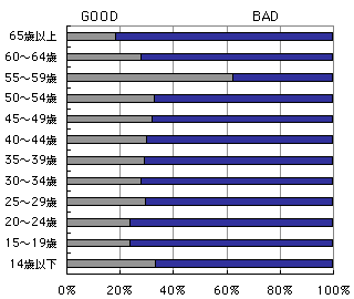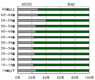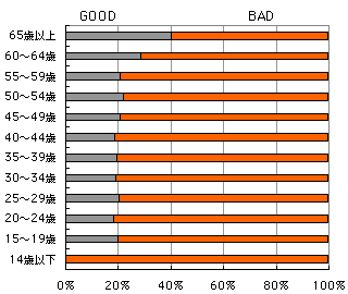 55〜59歳男性のGOOD率の高さが目立っています!! メールを紹介します。 ■■■■■■■■■■■■■■■■■■■■■■■■■■■■■■■■ 週刊誌…存在意義は感じます。 隠れた不正や物事を明らかにしたり、 粘り強い取材を通してTVや新聞では できない記事を載せて、それが社会を動かしたり。 でもそれらの「良い面」を遥かにしのぐ 「悪い面」のイメージがあまりにも強いです。 なのでBAD。 なにしろやり方が強引。 訴えられて裁判で負けても、素直に謝ってるコメントを 見た事がない気がします。 何かと言うと「表現の自由・報道の自由」を盾にして まるでそういえば何をやっても許されると思っていませんか? そして下品。卑猥な言葉や写真の広告は もはや“猥褻物陳列”にあたると思うのですがね。 芸能人のゴシップネタなども本当にくだらない。 (kuri) 週刊誌読まないんですけどね。 電車の中のつり広告見ているだけで嫌。 あれ見ていると、 日本にはエロと金にしか興味の無いオヤジと、 品の無いオバサンと、 何も考えてないワカモノしかいないのか、 と思います…。 多分そんなこと無いんですけどね。 日本にはまともな親父もいれば、品のある小母さんもいて、 きちんとものを考えている若者も たくさんいると思うのだけれど、 週刊誌は一体何処向いているんでしょうね? あれじゃ自分で自分の首を絞めているだけだと思います。 (Naka) 私はBADに1票。 私はあるタレントさんの大ファンですが、 週刊誌…どう考えても私たちや本人を 傷つける目的で書かれたとしか 思えないものが多い。 最近ではそれが分かってきたので むやみに立ち読みしたりしませんが うっかり開いてしまって その日一日へこむこともあります。 人気があるから書かれる訳で、人気の証なんだって 割り切れればいいのですが。 楽しい話題ばかりだったらいいのに。 人のプライベートに首を突っ込み 面白おかしく書きたてて…最低だと思います。 作っている人に罪悪感がないとしたら恐ろしい事です。 (ノブミ) 私は週刊誌を買わないが、 電車の吊り広告で内容はわかる。 覗き見。仲違い。他人の不幸は蜜の味。 女性誌ならダイエット、男性誌ならヌード。 でも「下品、低俗」で片付けるなかれ。 そこには、自慢できないマイナスな気持ちを 他人と共有することで楽しもうという、 プラスの知恵がある。 もしなくなったらストレスのガス抜きできずに グレる人が続出するかも!? ……でもGoodなイメージを持てないのよね。 世相や政治関連の記事が、文句ばっかりだからかな。 いくら必要でも、必要「悪」だからかな。 「Badだけど失くせないもの」ってコトかな? (30歳・女) BADに投票しました。 週刊誌っていつからあんなに俗っぽいものに なってしまったんでしょうか。 実はおじさんが買うような週刊誌を 20代前半によく 購入していました。 若干、オネエチャンの裸体などがあり、 購入するのも「恥ずかしいなぁ〜。」と思いながらも、 読みたい記事があったので買っていたのです。 でも、最近は『裸体がメイン?』と思われるような 雑誌が増えて...。内容も、 「批判だけ。」「スキャンダル。」「アラさがし。」 読んでいてウンザリ。 最近は買っていません!!! 女性週刊誌はもっと悲しい...。 (う〜はん:女:30〜34歳のあいだ) 答えは「BAD!」です。でも、 本当は「GOOD!」でないと、困るんですッ! いわゆる○○新聞の前に『大』がつくような そういう大手マスメディアが 追わないようなネタ、 或いは社会面でサラッと事実関係だけを 報道された、そういう、後追いの、 それでいて黙っちゃいられないような事を 「一般人」の立場から追って欲しいし。 歳が歳だから、昔の「トップ屋」さん達のイメージが どこかに残っているのだろうとは思います。 表通りじゃなくて、 どこか「お天道様のあたらないところ」を それでも充分にわかってやってる、 というそういうメディアのアウトロー的な 部分を求め過ぎてるのかなとも思います。 今は、いわゆるタブロイド紙もあるし、 テレビだとワイドショーのみならず 夕方のニュースでも、 芸能人の話もどんどん出てくるから、 週刊誌はいよいよアダルト系にいくのかもしれません。 この時代、売れりゃ御の字? いや、それでもイイ〜んですッ!(カビラさんぽく) この世の猥せつさを全て網羅するような世界でありながら、 それでも反骨精神を持っていてもらいたいって。 (セルライトも気になる主婦、東京在住、48歳) 今回の「週刊誌」、Goodに投票。 BADの方が割合的に多いようで、 今の所は、きっと最終結果も。 でも、じゃあなぜ週刊誌ってあんなに売れてるの、ですよ。 「フライデー」しかり、「週刊女性」しかり。 きっとBADなイメージが多いのは、 スキャンダル記事ばっかりじゃん、とか、 常に何かを批判してるし、とかだと思うんですけどね。 もし仮に週刊誌を買っている人がそれを BADなイメージとしてとらえつつ買っているのだとしたら、 それって変じゃん? いや、変