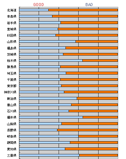 さらに、都道県別にも見てみました。 強いて言えば、北の方はBADが多いようです。