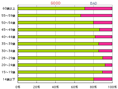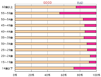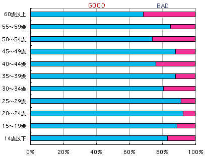 年齢別の集計は、次のとおりです。 20代前半がもっともGOODイメージが多くなっています。