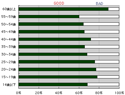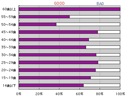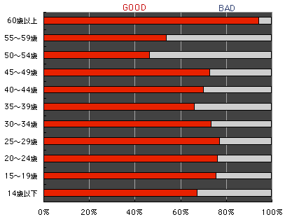 メールを紹介いたします! ■■■■■■■■■■■■■■■■■■■■■■■■■■■■■■■■ 昔は「暗い・地味」といった理由で 全く観なかったのですが、 この数年、嗜好が変わったように、日本映画に対しても 「奥深い・味わい深い」という具合に かなりGOODイメージに激変しました。 決定打は『たそがれ清兵衛』。 何がどういいと感じたのか、自分でもよくわかりませんが、 海外の娯楽大作と呼ばれるものばかり観てきた私には 自分の中に流れる「日本」というものを 外から初めて認識できた瞬間だったのではないかと 思います。 それからというもの友人に薦められるまま 日本映画を観て、ますます好きになりました。 海外映画でもできることではありますが、 島国日本だからこその文化・風習の中から 同じ日本人達が作り出す映像・音楽を通して 感覚的に「何か良いもの」を得られる、 ということがGOODなのかな〜と感じてます。 (かな・宮崎県・女性・26歳) 日本映画、今までは嫌いでしたよ。 なんかとってもチープな感じがしてね。 TVでやってても、ほとんど見たことないです。 でも、北野監督の『座頭市』を見てからというもの、 日本映画に対する感覚がかわりました。 恐るべし、北野武! (みゆきんぐ) GOOD!!!です。 劇場で見る映画の半分以上は、日本映画です。 最も印象深い作品は、 詩人金子みすゞを描いた『みすゞ』。 ヨーロッパ映画に負けるとも劣らぬ映像の素晴らしさ。 日本独特のスモーキーな風景の色合いは、 映画に向いているのだと思います。 TVドラマでもやっていたのを観ましたが、 同じモノを描いているとは思えないほどの違いが! 映画でなければ表現できないことが 沢山あるのだと思いました。 (東京都・女性・33歳) 日本人として自分の国の作品に けちをつけるのやなんですが 邦画って、本当に期待を裏切られる事多いです。 時代劇ものはいいなぁって思えるものが沢山ありますが、 SF系、現代劇になると、もう‥‥。 個人的な好みで言わせていただきます。 邦画は時代劇だけでいいです。 (まんまる顔) 考えるまでもなくGOOD!です。 てゆうか、GOODであってほしい。 GOODであらねばならない。 GOODであろうという気概を持って欲しい。 GOODであるべく奮闘努力せよ。 ‥‥みたいな気持ちです。 宮崎さんのアニメーションが当たるのはいいことだし、 たけしがカンヌで評価されるのも素晴らしいことだし、 だたそーゆうピンポイントな成功で喜んでないで、 「群」としての日本映画に、 もっともっと活力がほしいのです。 どんな新しいメディアが生まれようと、 最も深く、最も豊かな表現のできるのが、 映画だと思うのです。 GOODな映画を生めるかどうかで、 その国の文化度が測れる! とすら思います。 (東京都・女性・39歳) BADに投票しました。 理由は単純に面白くない映画が多いので。 それに、スケールが小さいので、 映画館で見るという必要がないです。 レンタルビデオをテレビ画面でみれば充分。 観終わった時、「映画を観たなぁ」という気持ちに あまりなれない‥‥。 何か、テレビの延長のような‥‥。 同じ時間を費やして映画を観るのであれば 洋画を迷わず選びます。同様に、音楽も洋楽のが良い。 今の日本のテレビや音楽にはガッカリしてます。 まともなのはニュースかNHKくらい‥‥。 (愛知県・男性・27歳) 実はあまり興味のもてないお題で、 投票をしないつもりだったのですが 明らかな好き嫌いの意識を持っていない人間が 投票することにも意味があるかと思い、投票しました。 このごろは「日本はまだまだいける」 「日本は本当はすごいんだ」という応援歌というか、 叱咤激励というか、そういう雰囲気にだんだんですが 飽きかけていて、それは私の勝手なんだけれども、 日本映画もそんな雰囲気の中で 「すごいんだ」と思わなければいけない強迫観念が ありました。一瞬、Goodに入れそうになりました。 でも、日本映画をあんまり見たことないんです。 たくさんの方々が海外でいろんな映画賞を 受賞されています。 でもやっぱり自分から見ることはほとんどありません。 そんな私はBadに入れるしかないかなあ。 (みみ・30歳・女性・東京都) GOODに一票です。 十代までは、あまり日本映画に 親しみが持てませんでした。 とにかく、ほとんど見たことがなかったんです。 地味というか、泥臭いというか、 暗そうだったり、暑苦しかったり。 華やかで夢に満ちたアニメやハリウッド映画に比べて、 娯楽として、オンナコドモには 魅力的と思えなかったのです。 なんか黒澤明という人のがすごいらしい、と聞き、 新作公開された『夢』を見ました。 その映像美とイメージの強さに圧倒され、 思っていたのとはちょっと違うと思いました。 その後、なんといっても『七人の侍』だと聞いて、 久々に劇場にかかったのを見に行き、 「名作には名作の理由がある」と感じました。 無条件降伏してしまったのは、 友達に勧められて見た、『隠し砦の三悪人』で