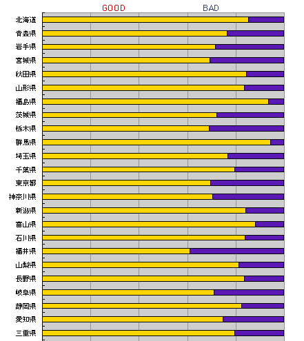 県別に見てみました。 いつもは比較的、どのお題でもGOODが多めの九州が、 珍しくBAD優勢になりました。