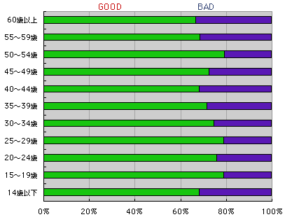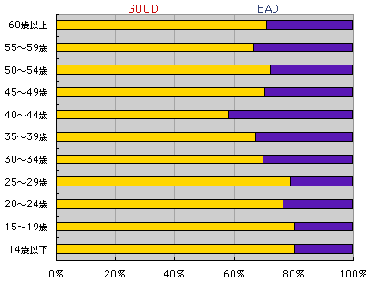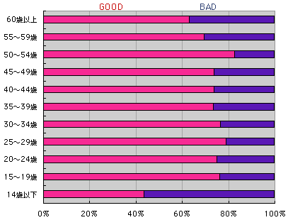 年齢別では次のとおりです。 年齢の低い方にGOODが多くなっています。