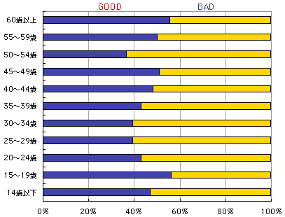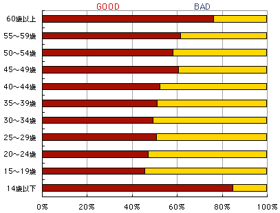 年齢別では次のとおりです。 20代から30代はGOODが少なくなっています。
