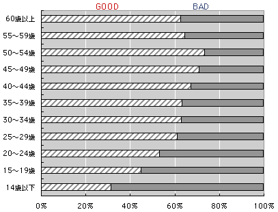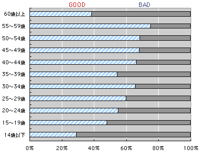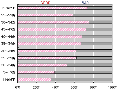年齢別に見ると、意外でしょうか、 思ったとおりでしょうか、年齢の低い方より 高い方のほうがGOODなイメージを持っているようです。