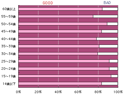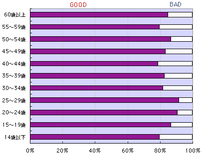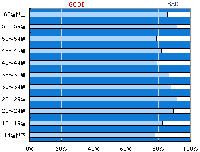 性別にみると、ほんの少しですが、 男性の方がGOODの割合が高くなっています 。