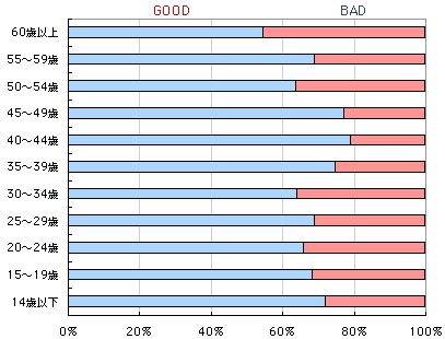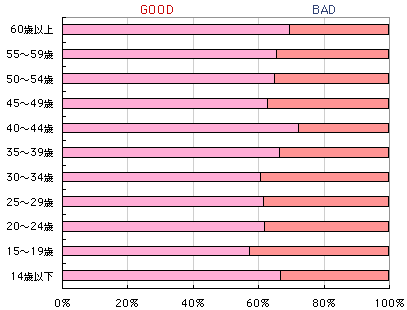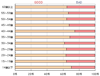 年齢別にみると、30〜40代に比較的GOODが 多くなりました 。 また、いつもGOODが低めの14歳以下でも 今回はGOOD派が多くなりました。