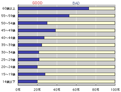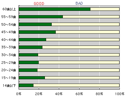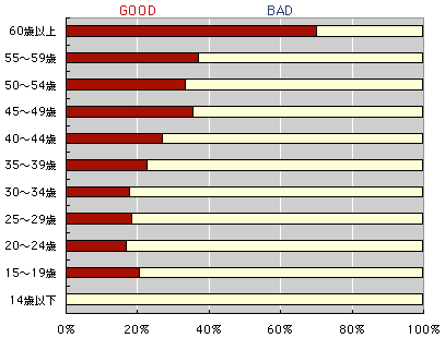男女別では、男性の方がGOODが多くなっています。 さらに年齢別にみると、先程の全体の年齢別グラフと、 どちらもまったく同じカーブになりました。