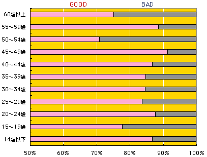 年齢別にみると、女性はばらばらのようです。 男性は、30〜40歳代に比較的BADが多くなっています。