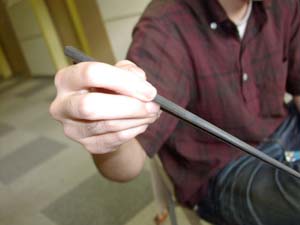 先週、放送された「GOODS JOCKEY」の初回の商品は darlingが小山薫堂さんから紹介をしていただいて、 重宝している「青黒檀の江戸八角箸」でした。 ![]() 商品が決まってから、この1万5000円のお箸を どのように伝えていくか いろいろと調べ、取材をし、考えていきました。 ほぼ日乗組員とともに、 調査、取材にフル回転をした GOODS JOCKEYの構成作家、 江秀樹さん(顔は疲れた藤井隆さんに似ています)に 番組では放送されなかったこぼれ話を聞いてみました! ほぼ日:はじめは、このお箸のことを まったく知らないところからはじまったんでしたよね。 江:はい。糸井さんや糸井事務所のメンバーに お箸の話を聴いてはじめて知りました。 まずは直接行って聴いてみようって思って、 いきなり佃島まで行ったんです。 ほぼ日:場所はすぐにわかりましたか。 江:民家が多い場所なので、 はじめは通りすぎてしまいました。 庇を出して、商売をしている感じの家が ひとつだけあったので、「ここかなぁ」って 思いながら戻ったんです。 ![]() ほぼ日:ちょっとお店っぽい感じだったんですか(笑)。 江:そうです。でもまさかなぁ、って半信半疑でした。 どちらかというと下町の縁側に棚を出して、 お箸を置いているって感じでした。 一級漆器製造技能士をとった時の写真が 飾ってあるのですが、 お箸と漆の漆器は無造作に置いてあるんです。 ほぼ日:江戸っ子のオヤジさんなんですよね。 江:そうそう、ちょうど 「急いでんでしょ。えっ? いいよ。いいよ。金は〜」って 威勢よく電話口で話しているところだったんです。 ほぼ日:中島さんにはどのようなことを教わったんですか。 江:番組の中でも糸井さんが試されたんですが、 こんにゃくがお店にも置いてあって 「ちょいと、つまんでみなよ」って言われたんです。 実は、ぼく箸の持ち方が悪かったので、 つまめなかったんです(笑)。 ほぼ日:売り文句が 「こんにゃくの端がつまめる」なのに‥‥。 江:そうなんです。中島さんに 「持ち方が悪いよ。箸は七分って言って、 上のほうを持たなきゃいけねんだ」って、 まずは持ち方の指導をしてもらっちゃいました。 ほぼ日:十等分をしたところの七分目ということですか。 江:そうです。 下のほうを持ちすぎると箸がすれ違ってしまうんです。 ![]() ×注意された持ち方(下のほうで持っています) ![]() ○教わった持ち方(七分のところで持っています) ほぼ日:お箸の持ち方以外にはどのようなことを 教わったんですか。 江:番組の中で、いろいろと糸井さんが話していたので、 聴いていただいた方は、わかっていると思うのですが、 青黒檀は非常に貴重な木なんです。 高いだけではなくて、 お箸に使える部分は、少ししかないんです。 木目がそろっていないと使えないんです。 ほぼ日:お箸にできる部分が少ししかないので、 どうしても高くなってしまうんですか。 江:「このパーツしかだめだ」っていう こだわりがあるみたいです。 ほぼ日:普通は青黒檀を使っているというだけで、 売りにしてしまいますよね。 江:このお箸を知って、 黒檀の箸がすっごく安く売られているのを みつけたんです。 「あれ? こんなに安いぞ?」って思って、 違いを中島さんに聞いてみたんです。 「安いのは、普通の木に黒檀を塗っているだけなので、 うちのとは違う」ということでした。 今回取り上げた江戸八角箸はまるごと青黒檀ですから。 最初、木から切り出してみて、 「お箸としていける」っていう 素材の部分のめぼしがついたら 立ちガンナという普通のカンナよりも 刃をたてたもので 4回角を落として八角にするんです。 立ちガンナで青黒檀のような硬い素材を扱うのは かなり難しいようです。 普通はガガガって、 ひっかかってしまたりするみたいです。 ほぼ日:中島さんがこのお箸をつくるのには どれぐらい時間がかかるんですか。 江:15分ぐらいみたいですね。 実際に作っているところを 見ることはできなかったのですが、 メンテナンスもずっとしてくれるので、 「どのようにしてもらえるんですか」って 聞いてみたんです。 ちょうどそこにあったお箸を やすりで研いでくれたんです。 研ぎ立てのお箸からすごくいい香りがしました。 ほぼ日:江さんはお箸を買ったんですか。 江:ぼくは少し安い紫檀のを買いました。 でもよくよく考えたらひとり暮らしだと ほとんど家で食事をしないんですよね(笑)。 まだ袋に入ったままなんですよ。 やっぱりちゃんと家庭を持つようになってから このお箸を使いたいです。 番組の中で、糸井さんも言っていましたが、 今のぼくにはちょっとまだ早い気がします。 ほぼ日:確かに、ずっと徹夜で、 家にほとんど帰ってなさそうですよね。 お疲れさまです!!