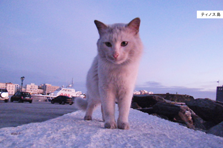 港のふちに座っていたら、白猫がやってきました。