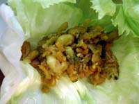 ☆ドライカレーのレタス巻き☆ <材料>1人分 レタス…20g(1枚) シーフードミックス…40g 人参…10g 玉葱…40g 油…3g にんにく…1ヶ しょうが…5g カレー粉…小さじ1 粉唐辛子…小さじ1 色々な香辛料…少々 醤油…少々 <作り方> 1)シーフードミックスは 縮まないように、下ゆでする。 2)野菜はみじん切りにし、 レタスは水にさらして ぱりっとさせる。 3)油でにんにく、しょうがを炒め、 玉葱を加えて更に炒める。 色が変わったらにんじんを加えて 更に炒める。やわらかくなったら シーフードと香辛料を加えて炒める。 4)仕上げに醤油をたらし、 レタスで春巻きのように 巻いて出来上がり。