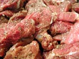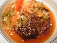 ☆牛肉のオレガノトマトソース☆ <材料>1人分 牛もも…60g 塩、胡椒少々 にんにく…半ヶ オレガノ…2g 玉葱…80g にんにく…半ヶ とうがらし…0.2g トマト…50g(1/2個) ピーマン…20g(1/2個) パプリカ(赤、黄)…10g(1個80g) 調味料: トマトケチャップ…小さじ1(5g) 塩…小さじ1/2杯 胡椒…少々 酒…15cc チリソース…大匙1(13g) 唐辛子…0.2g <作り方> 1)玉葱はみじん切りにして 電子レンジで5分柔らかくする。 2)野菜は大きめの角切りにして煮込み、 調味料を加え煮詰める。 3) にんにく、塩、胡椒で味付けした肉は オーブン200℃で、15分焼き その上からソースをかけて 更に5分焼いて出来上がり。