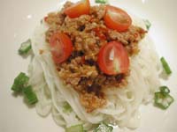 ☆ジャージャーそうめん☆ <材料>1人分 そうめん…60g 豚ひき肉…35g 長ねぎ…5g ぷちトマト…2個 もやし…10g レタス…1枚 オクラ…1個 きゅうり…20g 調味料: 酒…大さじ1弱 砂糖…大さじ1/2弱 みそ…大さじ1/2 豆板醤…小さじ1弱 ごま油…少々 <作り方> 1)そうめんを茹で、 (指示通りの時間)流水で冷やす。 2)オクラは塩で少しもんでから 塩を洗いおとし固めに茹で、 輪切りにする。 きゅうりとレタスは千切りにし、 もやしはさっと茹でる。 プチトマトは4等分に切る。 3)テフロン加工のフライパンに、 ごま油少量を入れて強火で熱し、 ひき肉を炒める。ボロボロになったら、 細かく切った長ねぎ、好みによって生姜、 にんにくを入れて炒め合わせる。 (テフロン加工のフライパンを 使用すると、少量の油で調理でき、 エネルギーカットになる。) 4)調味料を加えて煮たてる。 5)そうめんを器の中心に盛って、 周りに千切りにした野菜を飾る。 中央に4)のひき肉を乗せ、 プチトマトを綺麗に飾る。