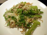 ☆アスパラガスのサラダ☆ <材料>1人分 アスパラガス…30g しらす干し…5g ごま…1g パセリ…0.1g ナチュラルチーズ…4g オリーブ油…1g ごま油…少々 <作り方> 1)アスパラガスは茹でて、 8cmの長さにそろえる。 2)しらす干、ゴマを油でいためる。 3)オーブン皿にアスパラを敷き詰め 2をかけて、その上に 好みのチーズを振り掛ける。 4)220℃で5分程チーズが溶けたら、 微塵にしたパセリをかけて出来上がり。