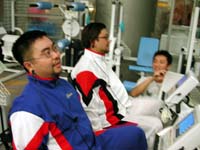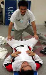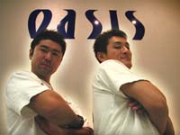 | 第1回 二代目ダイエット・ゲリラ始動! こんにちは、シェフ武井です。 今日から僕が二代目ダイエットゲリラの一員として 加入することになりました。 いつのまにか山へ帰ってしまった前任者にかわり、 ひとり残されたアッキィさんと僕とでタッグを組んで 新生ダイエットゲリラ、本日再始動です。 ともに昭和41年生まれの34歳。 鍛え直すにはちょうどいい年齢、だよねー。 ええと、まず宣言しておきますと、 僕、今の体形、ぜーんぜんヤじゃないんです。 世間では「デブ」と言われるけど、 食べるの好きだし、ビッグサイズ専門店に行かなくちゃ 洋服が買えない、ってほどでもないし。 しいていうなら、ズボンは『お直し』しないといけない、 というふうには、なっちゃってるかなあ。 でもほんのちょっとでいいんだ、体形の引き締めは。 吊るしのズボンが買えれば! だから、僕の「ダイエット」は、 世間でいう「すっきり痩せたい!」というのとは ちょっと違うんだ、ということを まず、言わせてください。(ちょっと珍しいけど) だが。だがだがだが。 「体形」はそのままでもいいんだけど、 「健康」については、ううむ、もちょっと、 なんとかしなくちゃいけないんじゃないかなあ、 と思ってたんです。 たとえば、階段で息が切れる、 ちょっと動くとすぐ汗をかいて風邪をひいて、 風邪をひくとこんどは腰が痛くなる。 これってやっぱ「デブ」のせいだよね。 こういう不健康は、ちょこっと肥満を解消したら すっきりよくなるんじゃないだろうか? つまり、 「見た目はデブでもいいけど、せめてもうちょっと、 堅く丈夫なカラダにならないものか?」 と思っている。それがいまのわたくしです。 理想を言えば、格闘家的なカラダがほしい。 やっぱ同じデブでも、文科系デブじゃなくて、 体育会系デブを目指したいよなあ。 じつは僕、そう思って、昨夏、ジムに通い始めました。 そしたら、いきなり体を酷使したせいで 腰を痛めてしまった。それきり運動はしてません。 そんなふうですから、 「厳しいトレーナーがいて、具体的な目標がある」 っていう状況、けっこういいぞ、って思ってます。 目標っていうのは、先代からひきついだ “体脂肪率20%”ってやつ。 これって、トレーナー陣が言うには、 けっして無茶なラインではなく、 ふつうにトレーニングを続ければ ラクにクリアできる数字だ、ってことらしい。 ほんとかな? いや、信じてがんばろう。 ![]() ![]() むかしのワタシ(55kg)と、いまのワタシ(81kg)。 さて、コンビを組むアッキィさんはどうか? ダイエットゲリラが休止して1年、 アッキィさんの身に起こった最大の出来事といえば 結婚でした。そう、アッキィさんたら、 じつはもう「モテたい!」というような ダイエットのふらちな目的は、失っているんだった。 たしか、結婚式を前にして、執念の食事制限で ずいぶんスッキリした体になったはずだしね。 でも、今回、ダイエットゲリラを再開する、 という企画をきいて、アッキィさんは乗り気になった。 なぜならアッキィさん、 ふたたび太りはじめていたからです。 新婚旅行で、ゴハンのおいしいイタリアに行ったのが きっかけで、リバウンドがはじまって、 さらに愛妻のおいしい手料理を夜遅めに食べる生活が続き、 すっかりハラが出てきてしまった、のだと。 いちばん痩せてた結婚式当日。 もうモテなくてもいいはずのアッキィさんだけど、 やっぱりいまの体形には不満があるらしい。 「欧米では、デブは仕事ができないだらしないヤツ、 というイメージだって言うでしょ? それに僕はデザイナーです。 そういう仕事をする人間が デブであっていいわけがない!!」 愛妻の手料理は食べる、けど太らないようにするためには やっぱり運動をするしか、ないのだった。 さて。というわけで、新生ダイエットゲリラである シェフ武井とアッキィさんは、今回からお世話になる 外苑前のジム「東急スポーツオアシス青山」に向かいました。 トレーナーは、前回から引き続いて担当してくださる 「ストロングス」所属の斎藤邦秀さんと、 今回から参加してくださる野上圭太さんのふたりです。 ストロングス所属のトレーナー、野上さん(左)と斎藤さん。 うはは、怖そう。でも実際はすごく優しいです。 優しいんだけど、トレーニングは厳しい。 このチームでの初日、 ぼくらは「まずは打ちあわせだよね」と思っていたんですが さっそく、鍛えられました。 「打ちあわせ? 体をうごかしながらでもできますよね!」 って。は、はい……。 自転車(エアロバイク)をこぎながら、 いろんな話をしてきましたよ。 ![]() うひー。つらい。 まず最初に決めたのは、チーム分けです。 あちらもふたり、こっちもふたり。 つまり、一対一のチームが、ふたつできる。 僕も、アッキィさんもけっこう忙しいので、 「二人揃わなくちゃ、できない」という状況を つくらないよう、アッキィさんには斎藤トレーナー、 僕には野上トレーナーが専属でつくこ