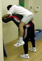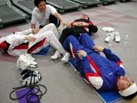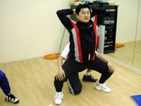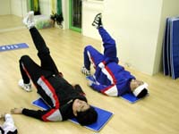 こんな風に同じ量を比較すると、 アッキィさんの疑問にも答えやすくなります。 2.うどんは高たんぱく低エネルギー? 表からも分かる通り、麺類は、皆360kcal前後です。 うどんだけがすごくエネルギーが 低いというわけでもありません。 たんぱく質でみてみると、 そばとスパゲッティが、 他の麺より高たんぱくです。 うどんより、そばの方が蛋白質量は高いのが 分かると思います。 3.ダイエットに向くのはどの麺? どの麺も、食べ方次第で、 ダイエットになるし太る原因にもなります。 たとえば、そばに関して言えば、 食物繊維、ビタミンの量が多く、 体内でのエネルギー代謝がしやすい状態、 ということができます。 また、そばに含まれている糖に、 ルチンという物質があります。 これは、毛細血管の強化作用があり、 脳出血などの出血性の諸病予防に効果があると いわれています。 また、そうめん(兵庫と奈良の特産!)は、 一番細いので、消化もしやすいです。 疲れているが、食べなきゃならん! という時や、 病気の時にお勧めです。 逆に、食べやすいので、多めに食べてしまって、 太ってしまうということも有りますので、 食べ過ぎに注意! 麺に乗っている具、からまっている具に、 野菜はありますか? とろみの液が多いと、エネルギーが高くなります。 麺だけでなく、ご飯も食べてしまっていませんか? 麺とご飯を一緒に食べるような食事では、 一回に3杯ぐらいのご飯を食べていることになります。 1日3杯が理想としている人は、 食べ過ぎになってしまいます。 3.麺の簡単茹で方 疲れた時は、茹る時間も待ちたくない! そんな時は、電子レンジを使いましょう。 大きめの容器に水420gをいれ、 そこに麺を80〜100g折って入れて ラップをして5分! (麺が細い時は3分半で様子を見てください) スパゲッティ、うどんの時は塩を入れるのを忘れずに。 4.夜の麺料理でふとりたくない! たとえばスパゲッティの場合、 和食風にして、ホワイトソースなどの カロリーの高いソースは避けましょう。 野菜量は多いほうが、体内での消化吸収速度も ゆっくりになってお腹も一杯になり易く、 肥満防止になります。 以上、参考にしていただけたら、幸いです。 (小野田 愛) -------------------------------------------------- うううううううーん。そっか。 「めん類だから太る」んじゃなくて 「食べ過ぎればなんだって太る」 「バランスの悪さは肥満につながる」なんですね。 (そりゃ、あたりまえだ。でも、その当たり前のことを、 太ってる人は、なかったことに しちゃうんですよねえ……) 僕、パスタ大好きで、 500グラムのパスタ、3回で食べちゃう。 それもペペロンチーノとかの具なし系。 それだけで食事すませちゃうことが多々あります。 これ、よくないよねえ。 パスタの量を減らして、そこに、それこそ 緑黄色系の野菜をたっぷりとか、鶏のササミなんかを 加えれば、いいんですよね。 ちなみにこのごろ僕の昼ご飯によく起用されるのが 麻布十番の更級堀井の「とりわさそば」です。 あつあつのおそばの上に、わさびを塗って海苔で巻いた 半生のササミが3本、のってるの。 これ、悪くないですよね。 それから、小野田先生は言及しておられないけど ラーメン(中華めん)についても調べてみたところ、 ひと玉のカロリーって、そんなに変わらないんですね。 だから、これも、めんそのものよりも、 脂ぎとぎとで調理しちゃうとか、 野菜とたんぱく質が足りないとか、 そういうバランスが問題なんでしょうね。 ----------------------------------------------- では、今回のトレーニング。 いつもはマシンが中心なんですが 今回は小さなスタジオの空き時間を使って 「自体重トレーニング」です。 自分の体の重さを使った運動ですね。 いやはや、撮影したら、まぬけなこと……。 さくっと並べてみます。笑って。 ![]() ランジウオーク、ひねり入り。 のばした脚の付け根の表側が、痛い。 ![]() ヒップリフト。 片脚と両肩で支え、何度も上下。ツライ。 ![]() ゴムチューブを使ってアームカール。 これは自宅でもできるぞ。 ![]() あたたたたたたたた。 ワイドスクワットです。 ![]() 馬乗りされて、ふくらはぎを鍛えてます。 カーフレイズっていうんだって。 シェフは腰痛がこわいのでパス。 ![]() 三人で脚を組んで、腹筋。 でぶ三つ巴。悲し。 ★今回のトレーニングメニュー