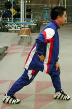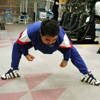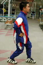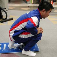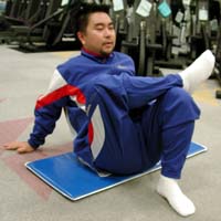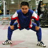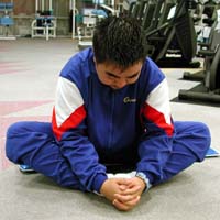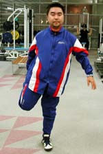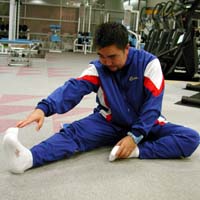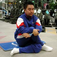 | 第12回 ストレッチのこと・後編 そういえば! 気がつかないのもマヌケだと思うけど、 腰が、痛くない! と喜んでいるシェフ武井です。 ちょっと風邪ぎみなのに、腰が痛くないなんて、なぜ!? (いつも、体調に比例して、腰痛がおきてたんです。) ロドさんがギックリ腰になったから 僕の腰痛がよくなった? なわけないですね。 たぶん、ちゃんと腹筋と背筋がついてきたのでしょう。 まだまだ厚い皮下脂肪に隠れてわからないけど、 きっとそうにちがいない。 腰が痛くないってこういう感じだったんだなあ、 と、GW中はやたらと散歩をしています。 楽しくて。 階段なんかも2段とばしだよ〜。 (でも寒いのに半ズボンはどうかと思う、われながら。) それにしてもこのところトレーニングがきついなあ。 なんでだろ。あ、そうか、 ロドさんが休んでいるから、 野上トレーナーは僕の面倒だけ見れば、 よくなっちゃったんだね。 一対一になれば、 インターバル(運動と運動の間の時間)が減る。 トレーニング内容も、以前は、 「タケイさんは腰痛もちだから」と ちょっと甘めにしてもらっていたのが、 もう遠慮なしだもんねえ。 きついわけだ。 ジムの筋トレは、マシンごとに鍛える筋肉が異なるから、 続けてやってても大丈夫なわけだけど、 「ハイ休まずに次!」 「水飲んだらすぐ次!」 「大丈夫ですよねハイ次!」 と、ほんとー体育会系なの。 ちょっとは加減してください、野上トレーナー。 だめ? だめか。わかりました、がんばります。 さて、トレーニングがきつくなればなるほど 大事になるのがストレッチです。 前回に続いてストレッチの実践編をお届けしますよ。 「立ってやる」のが、運動前、 「座ってやる」のが、運動後、です。 そうでなくちゃいけない、というわけではなくて、 そのほうが「気分として、やりやすい」からです。 座ってやるほうは、家でも実践しやすいよ。 では、今回のモデルは僕。 こうしてみるとまだまだデブだねえ。 【立ったまま(運動前に)1】